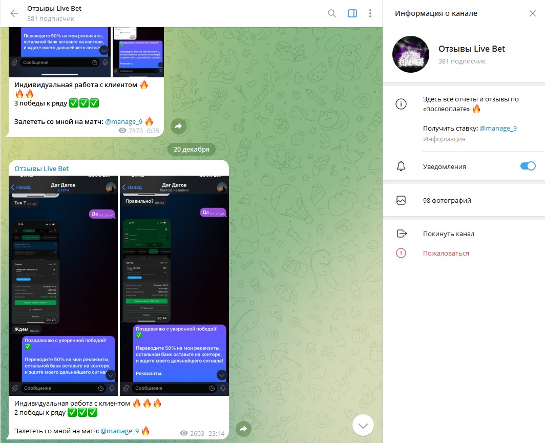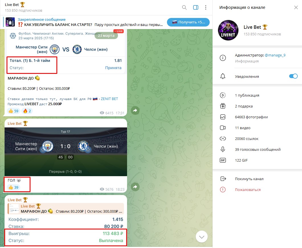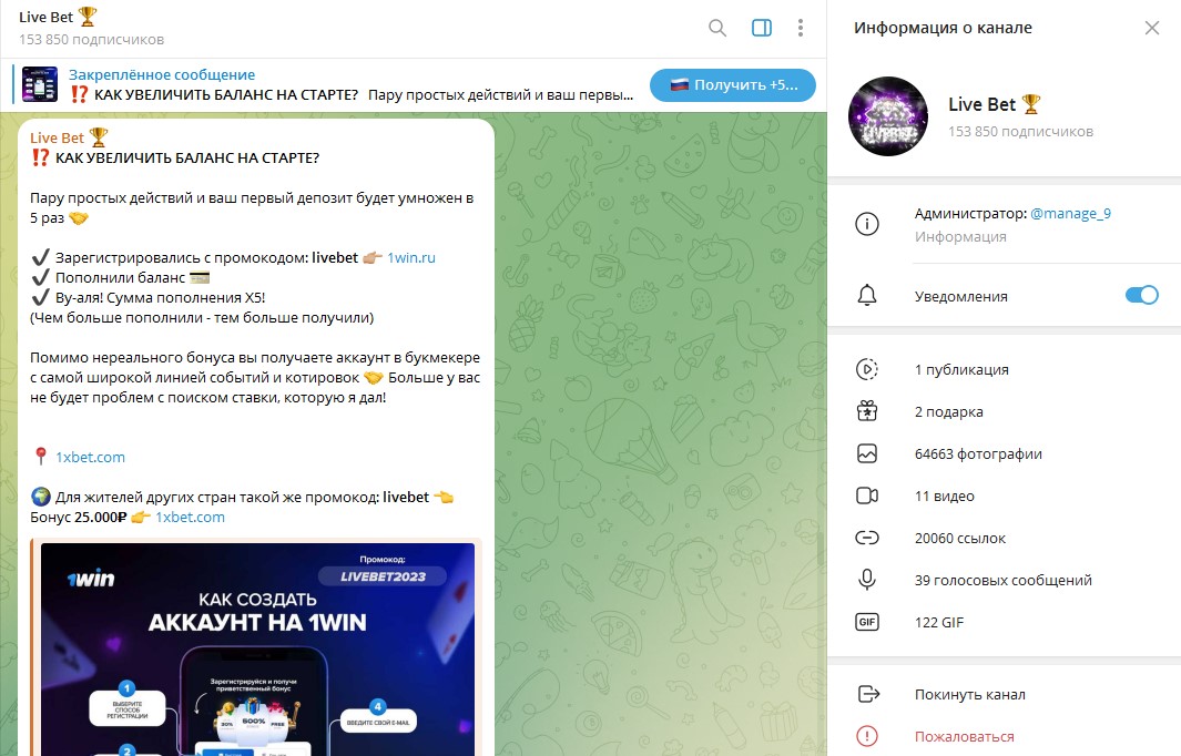 Деятельность телеграмм канала Live Bet