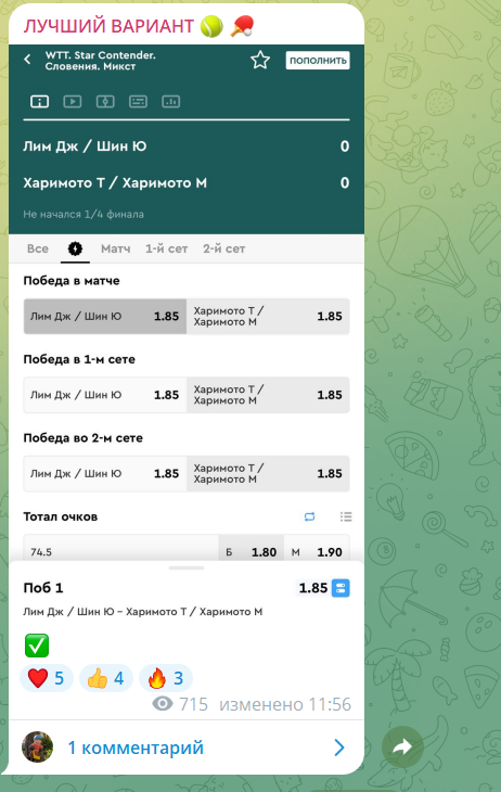 Лучший Вариант — канал в телеграмм, где публикуются прогнозы на спорт: футбол и теннис. Прогнозист lychiyvar предлагает ставки с коэффициентами 1.6–2.0, включая экспресс. Прозрачность отчетности вызывает сомнения, так как нет скринов или верификации. Репутация ресурса под вопросом.