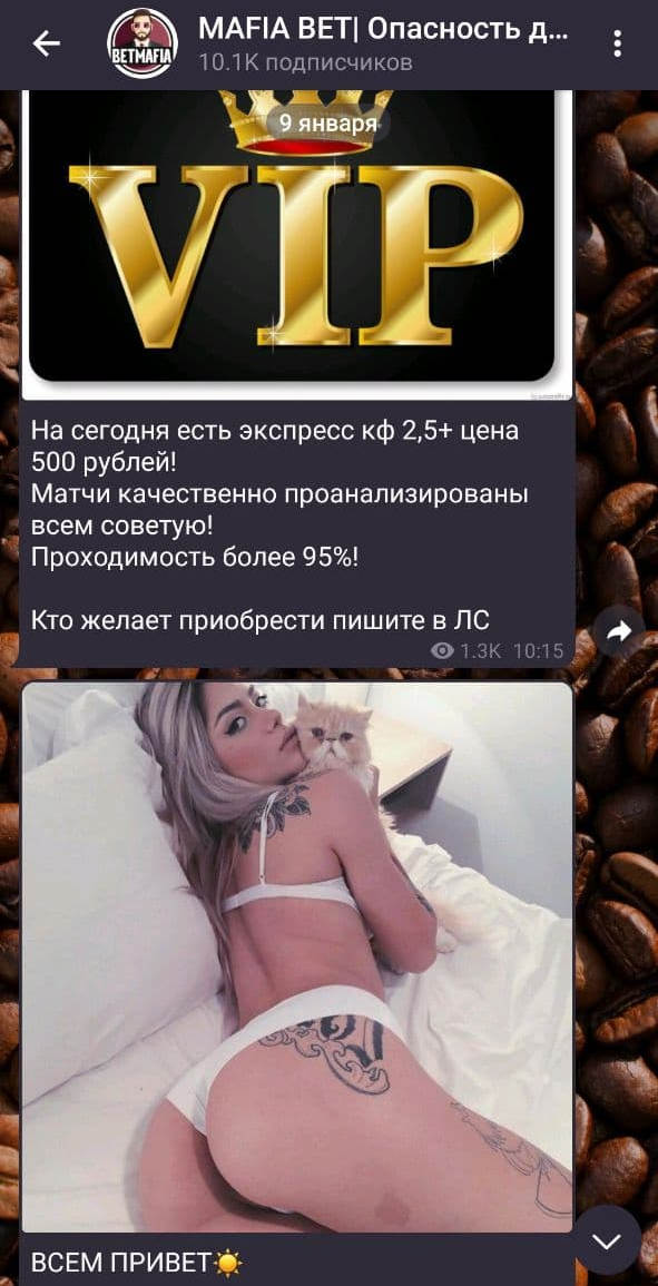 Купился на дешёвый прогноз и влип, потерял и бабки, и время, и нервы. Никому не советую ввязываться в историю с Мафиа Бет. Ничего на канале хорошего не вижу.