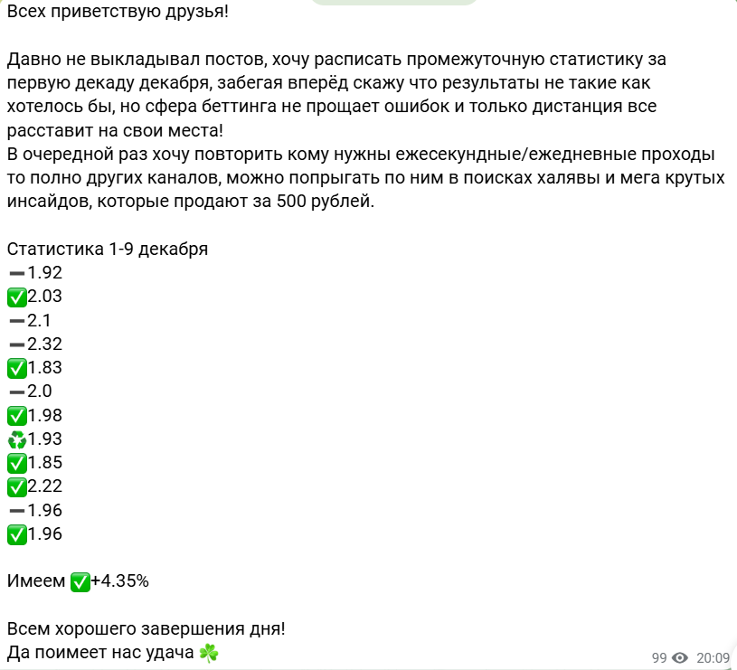 Админ проекта не предлагает платные экспрессы и ординары, подписки на ВИП чаты. Все его прогнозы бесплатные и могут использоваться в качестве дополнительного источника информации. Игроки не сливают деньги, покупая неудачные ставки.