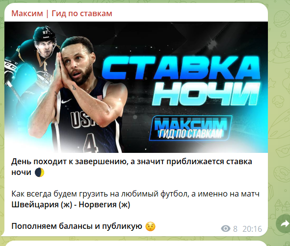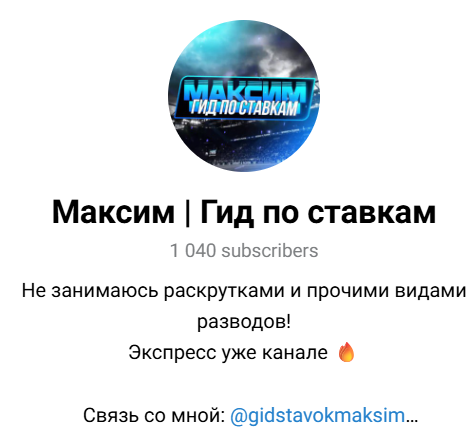 Контент типичен для мошеннических схем: обещают быстрый заработок, хвалят "уникальную" аналитику. Он периодически меняет имена, раньше канал назывался “Магия ставок”. А недавно каппер убрал фамилию, оставив просто “Максим Гид по ставкам” — все это признак зачистки репутации. Также есть явная накрутка аудитории, при 1000 подписчиков на последних постах всего 9-10 просмотров. Когда все честно, так не бывает.