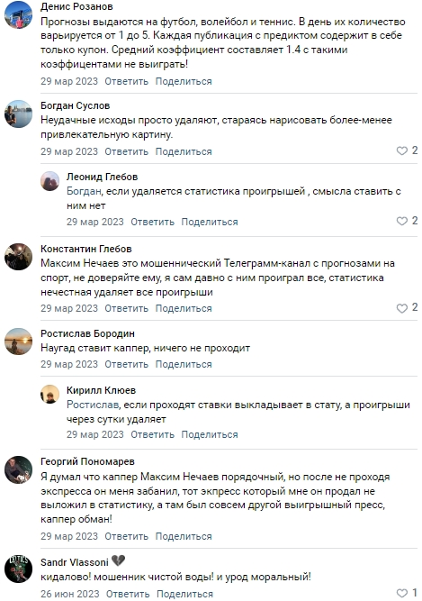 Канал @maksimnechaevbet и neshaev_maks не внушают доверия. Для ставок на спорт лучше выбирать надежные ресурсы с открытой статистикой. Риск мошенничества, слива банка и потерь высок. Сотрудничество с командой Максима Нечаева не рекомендуем.