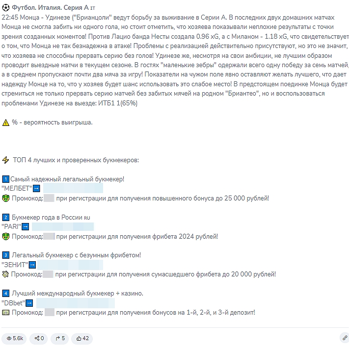 Один из способов его пассивного заработка — бесконечная реклама различных БК, дополненная скопированной со сторонних ресурсов «аналитикой игр». К большинству постов та вовсе отсутствует — «лучший каппер» просто спамит в ленту Mur Vulok предиктами на футбол, хоккей и прочие дисциплины. Так он рассчитывает слить банк игроков и получить щедрые отчисления, в зависимости от конторы для развода достигающие 60 %.