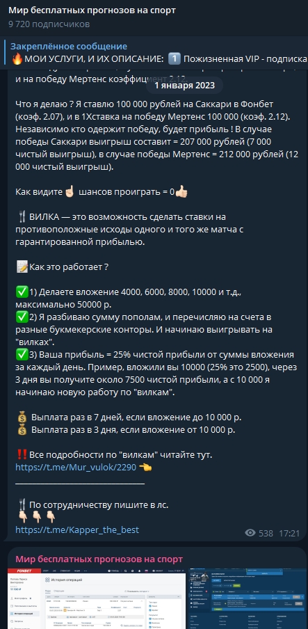 Мир бесплатных прогнозов на спорт — канал в Телеграм аналитика @Kapper_the_best, рекламирующего «надежные БК» и десятки прогнозов на спорт ежедневно. По его мнению, сотрудничество принесет игрокам «золотые горы» и позволит «забить» на работу, но активность в принципе не выдерживает критики. Разберем фейки персонажа в разоблачении Mur Vulok, чтобы не потерять деньги после ставок и «раскруток счета» с Константином Полем.