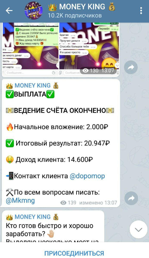 Таким образом, вам лучше отказаться от работы с капером из MONEY KING. Также избегайте всех Телеграмм-каналов, предлагающих раскрутку счета на любом виде заработка.