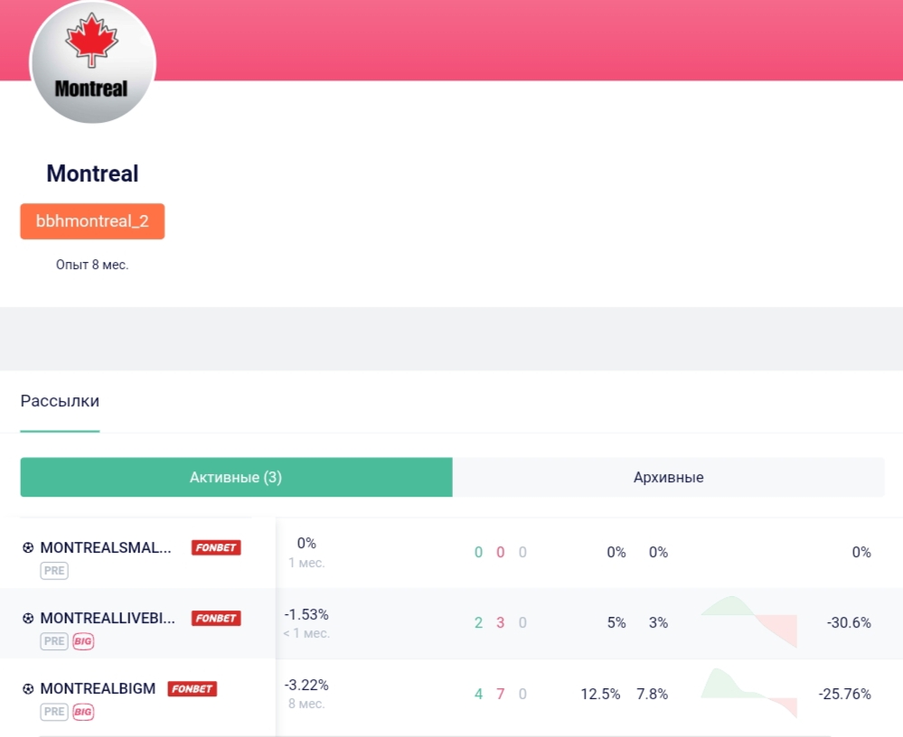Каппер ничего не скрывает - это однозначно плюс! Каппер уходит постоянно в минус - это точно минус!! Так что не вижу в принципе никакого смысла подписываться на Монреаль. Какой мне профит ставить по минусовым прогнозам?