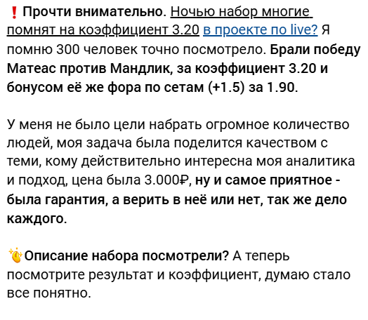 Все посты с наборами в ВИП чат, платными прогнозами удалены, известно только, что подписка стоила 3 тыс. рублей, была гарантия. Странно, что каппер периодически удаляет с канала информацию по платным услугам.