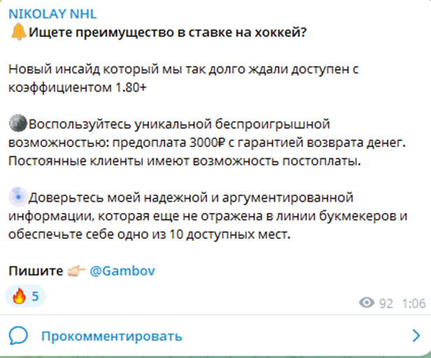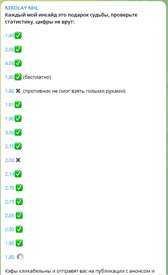Как можно догадаться по названию, телеграмм-канал «Николай НХЛ» посвящен заключению пари на хоккейные матчи. В открытом доступе подписчики могут найти ординары и экспрессы. А вот получить предикт с инсайдерской информацией можно за отдельную плату. Далее мы узнаем, можно ли на практике заработать с помощью платных ставок на договорные игры от аналитика.
