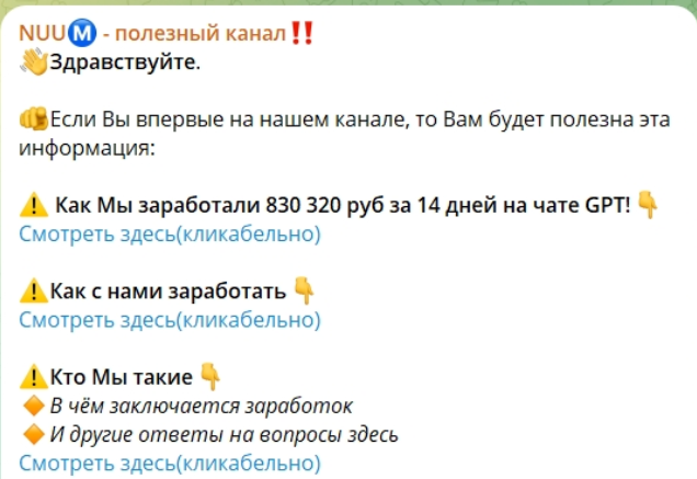 Особенность NUU полезный канал в использовании бота для ставок на спорт. В первом посте админ говорит о высокой эффективности искусственного интеллекта, помощи в точном прогнозировании и заработке. Использование Gpt чата – не самый надежный способ, часто дает сбои. Необходимо самим хорошо разбираться в беттинге, анализировать матчи, а не доверять исключительно нейросети.