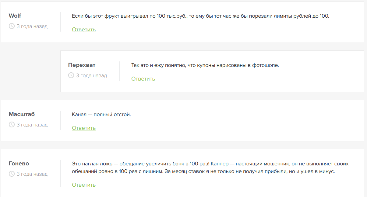 Большая часть игроков догадалась, что на канале рисованная статистика, купоны из фотошопа. Опытные беттеры уверены в мошенничестве аналитиков, поскольку БК блокируют аккаунты, если фиксируют с них крупные поступления.