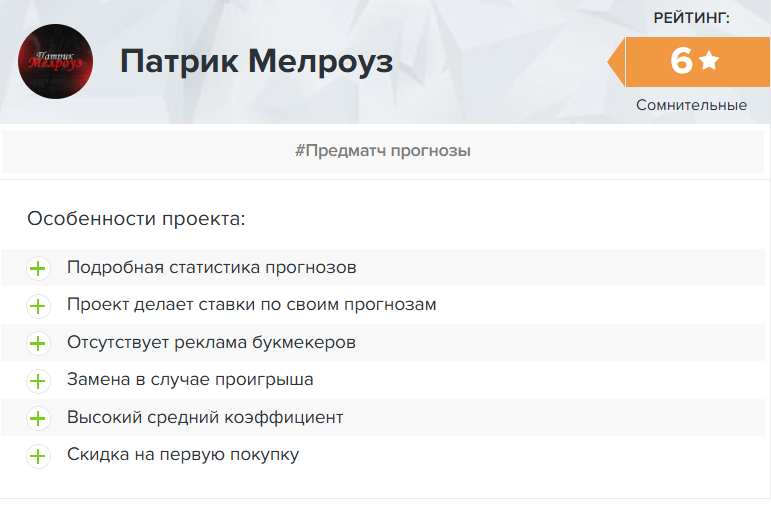 Поскольку сейчас телеграмм канал Патрик Мелроуз пропал, нам пришлось изучать ранние обзоры на каппера. На сторонних площадках выделяли следующие положительные стороны.