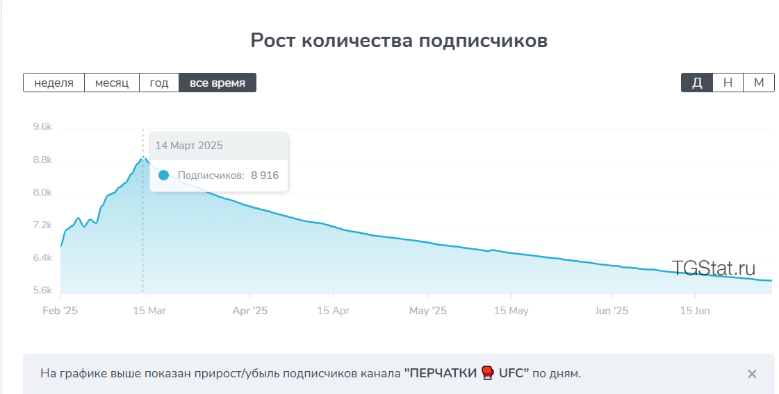 Канал создан 12.09.2024. На него сейчас подписано 5 887 пользователей. Активность согласно TGStat — 15%. Анализ аудитории привел к тому, что мы зафиксировали регулярный отток начиная с марта 2025 года. Судя по всему, изначально была активная рекламная компания с накруткой, а теперь люди покидают канал.