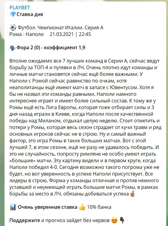 Контент канала PlayBet состоит из бесплатных одиночных ставок с кратким описанием предстоящих матчей. В каждом прогнозе указывается коэффициент на выбранный исход. Платных подписок и ВИП-чата нет. Основной акцент сделан на рекламу нелегального БК. Каппер обещает игрокам бонусы, быстрые выводы и высокие кэфы. Однако данная реклама направлена исключительно на получение прибыли по партнерской программе, доход с которой формируется за счет проигрышей подписчиков.