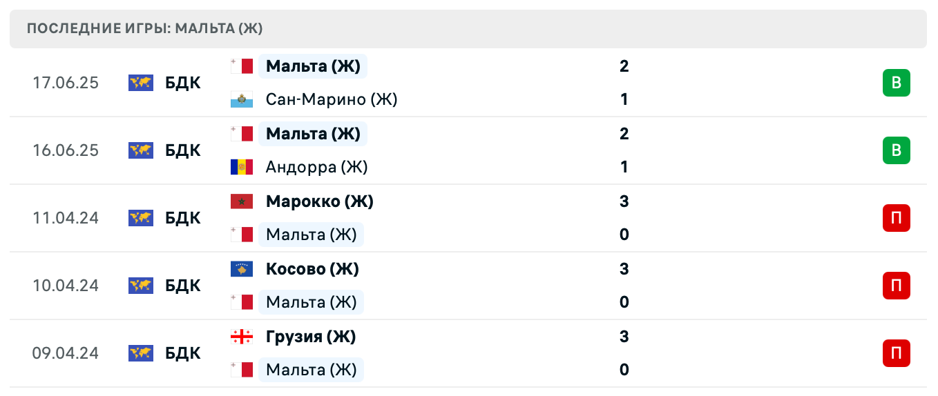 - 17.06.25 — Мальта (Ж) 2:1 Сан-Марино (Ж) — победа