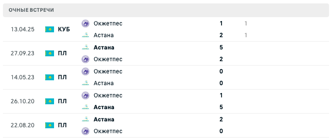 Астана имеет уверенное преимущество в очных матчах с Окжетпес. За последние пять встреч столичный клуб четырежды праздновал успех и один раз сыграл вничью: