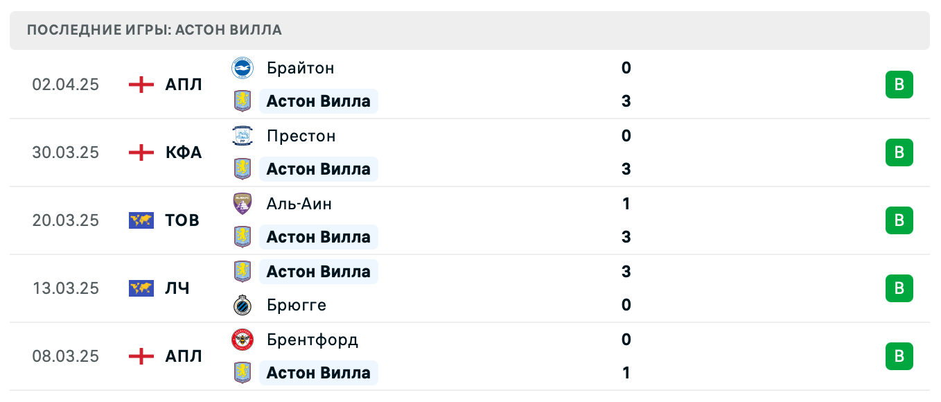 Астон Вилла демонстрирует мощную серию из пяти побед подряд. Клуб не пропустил ни одного мяча в трёх последних матчах, обыграв Брайтон (3:0), Престон (3:0) и Аль-Айн (3:1), а ранее уверенно справился с Брюгге в Лиге чемпионов (3:0) и с Брентфордом в АПЛ (1:0).
