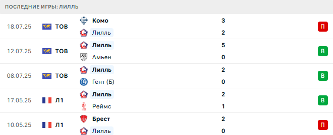 После неудачного старта прошлого сезона Лилль в его завершении продемонстрировал хорошую динамику. В последних официальных матчах команда показывала устойчивый результат, включая уверенные домашние победы и стабильность состава. Последние пять игр завершились тремя победами и двумя поражениями.