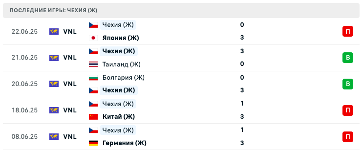 Чехия завершила Лигу наций с двумя уверенными победами над Таиландом (3:0) и Болгарией (3:0). Пусть соперники и не из топ-уровня, но чешская команда продемонстрировала слаженную игру и надёжную подачу.