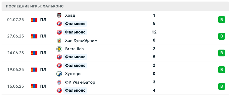 5 июля 2025 года в 11:15 по московскому времени на поле вновь сойдутся Фальконс и Тув Буганууд. Это противостояние стало уже традиционным для монгольской Премьер-лиги, но в этот раз ожидания особенно высоки: одна команда на пике формы, вторая — в поисках света в конце туннеля. Разберем всё по порядку: статистику, форму, шансы и коэффициенты.