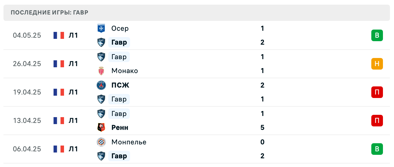 - Гавр – Ренн 1:5 (поражение)
