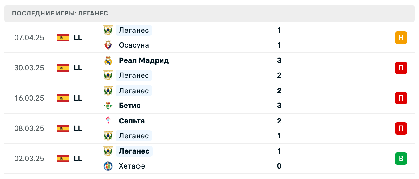 В последних пяти матчах Леганес выиграл только один раз (против Хетафе 1:0), трижды проиграл и один раз сыграл вничью. Поражения от Реала (2:3), Бетиса (2:3) и Сельты (1:2) подчеркивают проблемы в обороне.