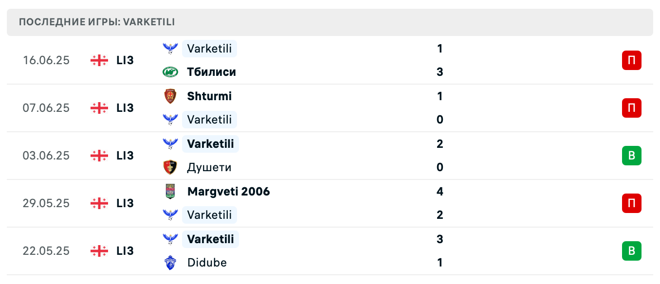 - 16.06.25: Варкетили – Тбилиси 1:3 (поражение)