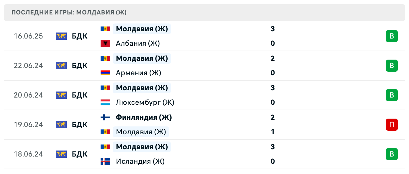 - 16.06.25: Молдавия (Ж) – Албания (Ж) 3:0 (В)