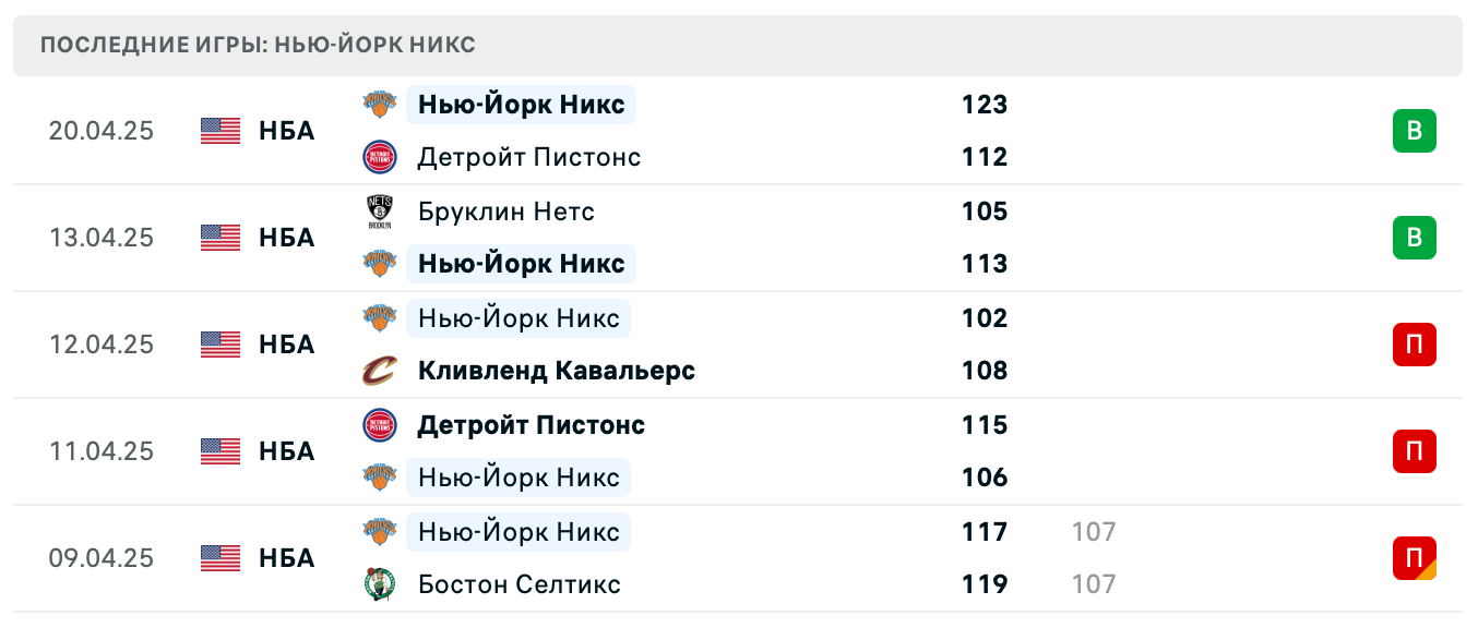 Команды подходят к плей-офф с разной динамикой. Нью-Йорк Никс демонстрирует умеренно стабильную игру, тогда как Детройт Пистонс испытывает трудности в защите, несмотря на высокую результативность.
