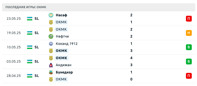 ОКМК показывает переменчивые, но в целом позитивные результаты. Из последних пяти матчей два завершились победой — над Коканд 1912 и Андижаном.