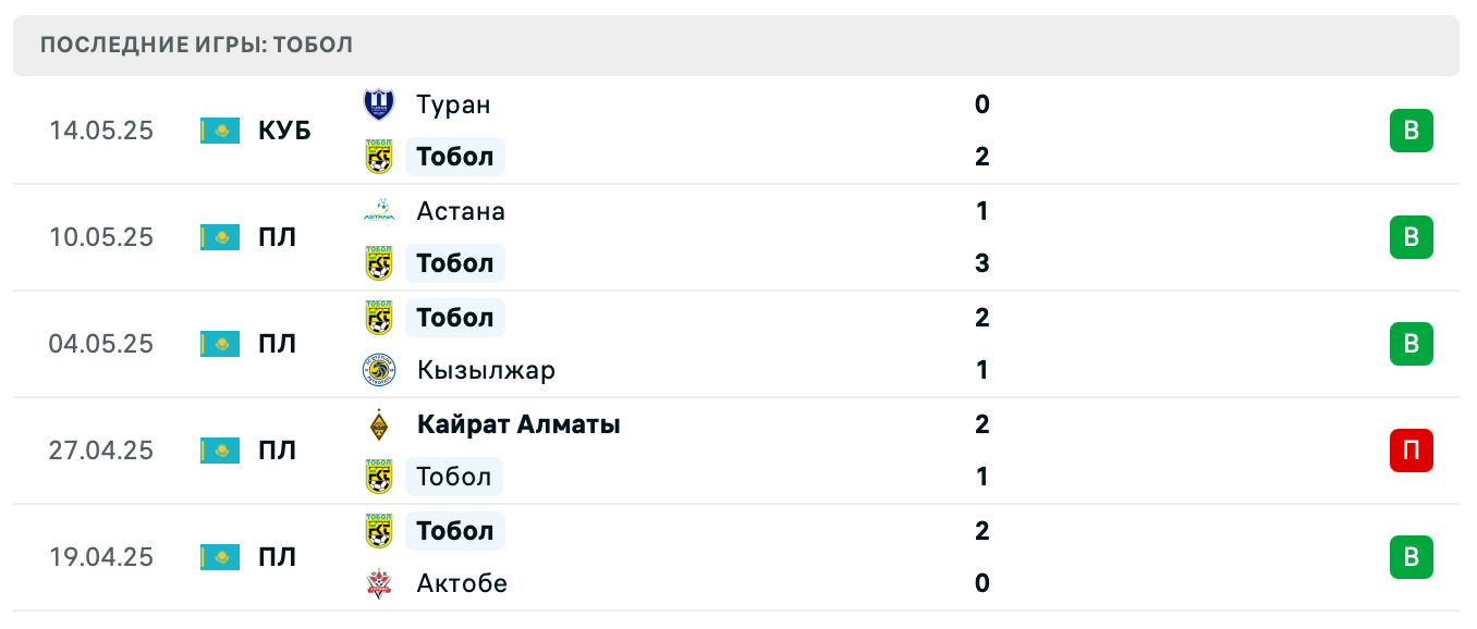 - 04.05.25 — Тобол 2:1 Кызылжар