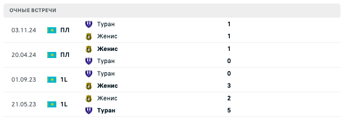 В сезоне 2023 команды обменялись убедительными победами: Туран выиграл 5:2 на выезде, но уступил 0:3 дома. Такая история встреч говорит о равенстве сил и непредсказуемости результата.