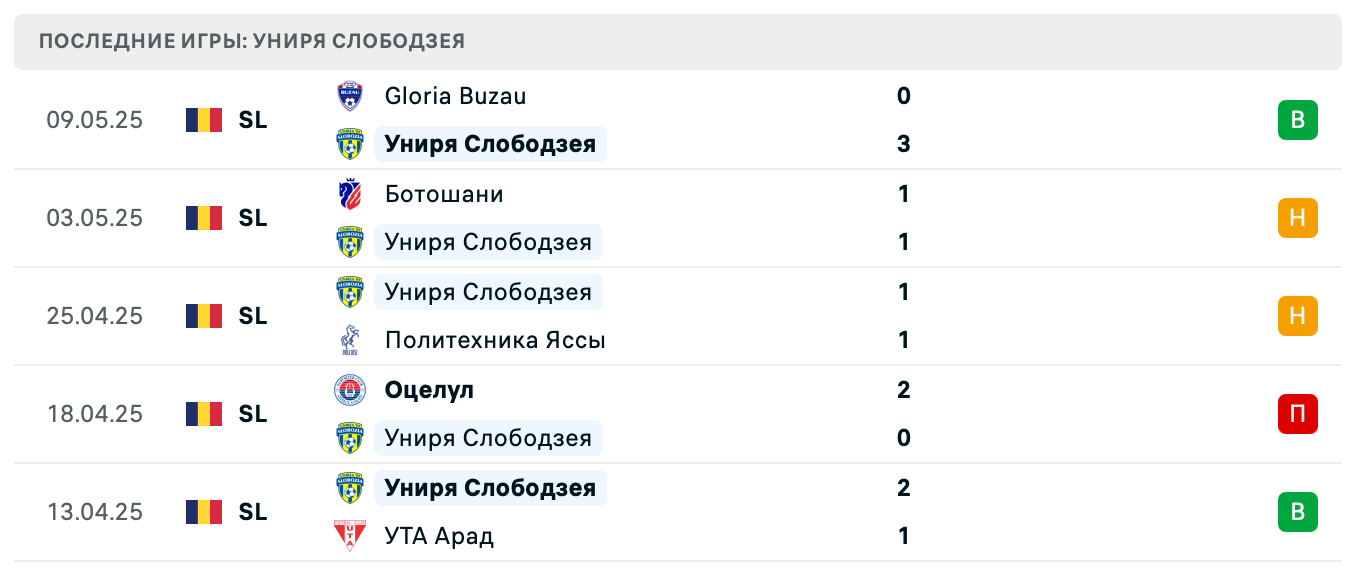 - 09.05.2025 — Gloria Buzau 0:3 Униря Слободзея (Победа)
