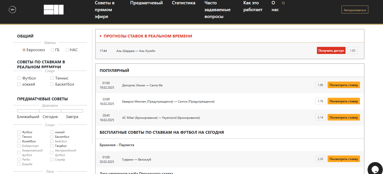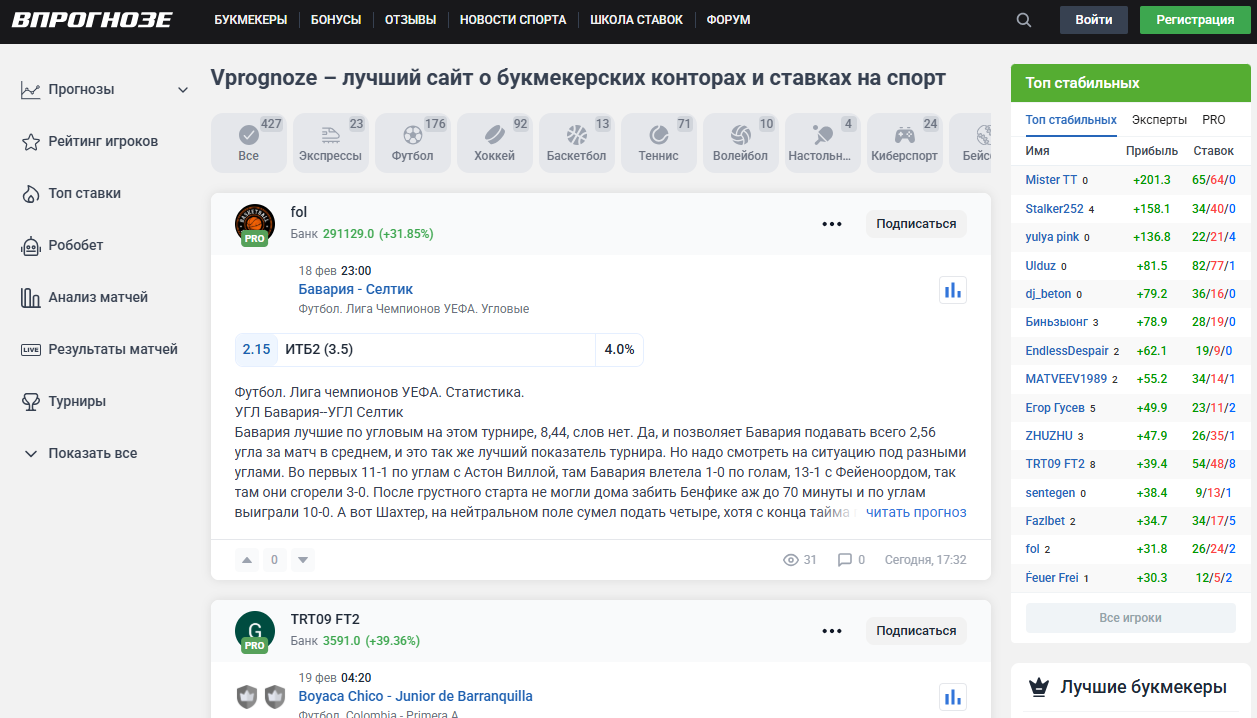 Впрогнозе — это одна из самых популярных площадок с прогнозами на спорт в СНГ. И наверное, самый популярный верификатор ставок на спорт. Любой пользователь может начать оставлять прогнозы на сайте и со временем выставлять ценник за свои ставки. На сайте есть отдельный раздел с платными прогнозистами, где можно покупать подписку и смотреть статистику капперов. У сайта очень удобная навигация, и вам не придется переходить на сторонние ресурсы, чтобы узнать нужный прогноз.