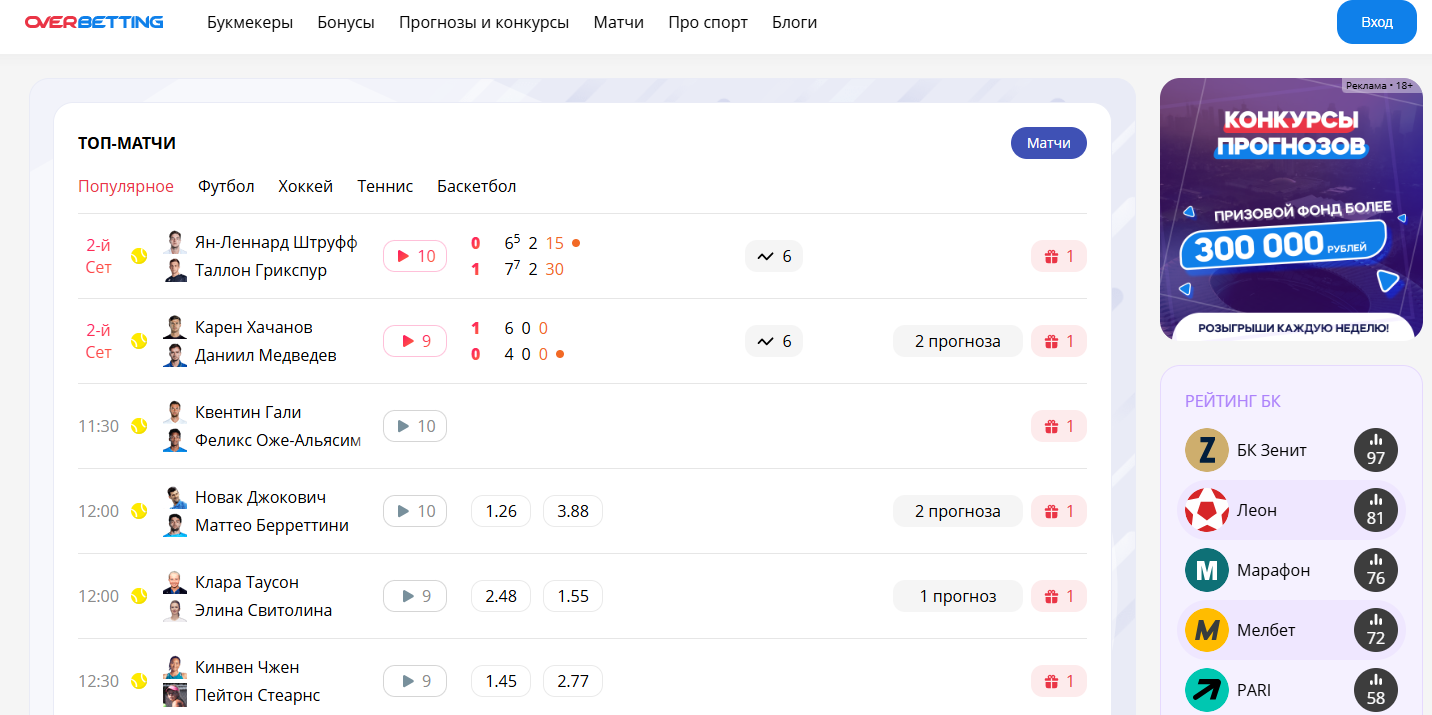 Овербеттинг — это сайт с пользовательскими прогнозами, где игроки могут оставлять свои ставки. Но там нет платных прогнозов, и вся информация находится в свободном доступе. При этом сайт регулярно проводит розыгрыш денежных призов, в котором может поучаствовать каждый прогнозист. У кого лучше статистика — тот и побеждает.