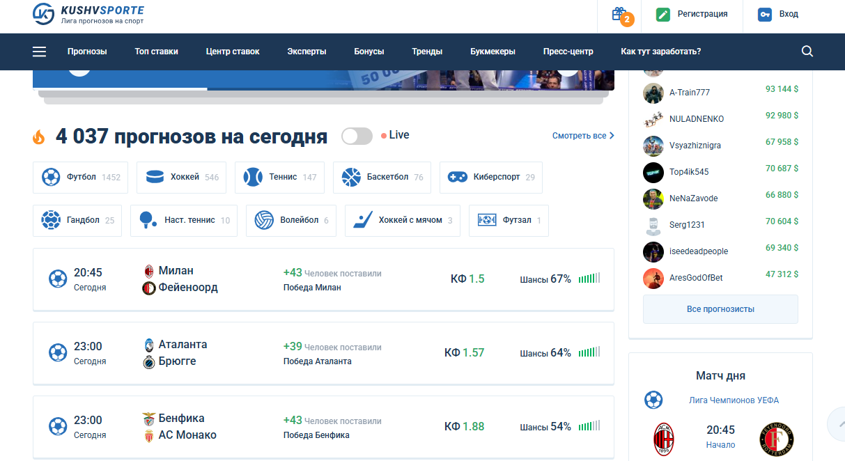 Кушвспорте — это классический верификатор спортивных прогнозов с возможностью покупки ставок. На сайте представлена подробная статистика всех игроков, которые размещают свои прогнозы и ценники на их услуги. Средняя подписка на хорошего игрока стоит около 200 рублей в день. На сайте есть все популярные виды спорта, а также экспресс-прогнозисты.