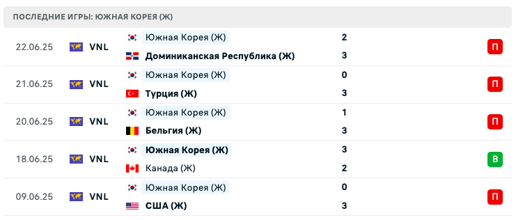 Южная Корея (Ж) провела пять непростых матчей в рамках VNL. Победа над Канада (Ж) со счётом 3:2 стала единственным светлым пятном в череде поражений от таких сильных соперников, как Доминиканская Республика (Ж) (2:3), Турция (Ж) (0:3), Бельгия (Ж) (1:3) и США (Ж) (0:3).
