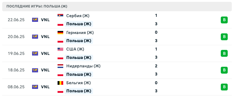 Встреча 30 мая 2024 года в рамках VNL завершилась уверенной победой Польша (Ж) со счётом 3:0. Это свидетельствует о серьёзной разнице в уровне и физической готовности на данный момент.