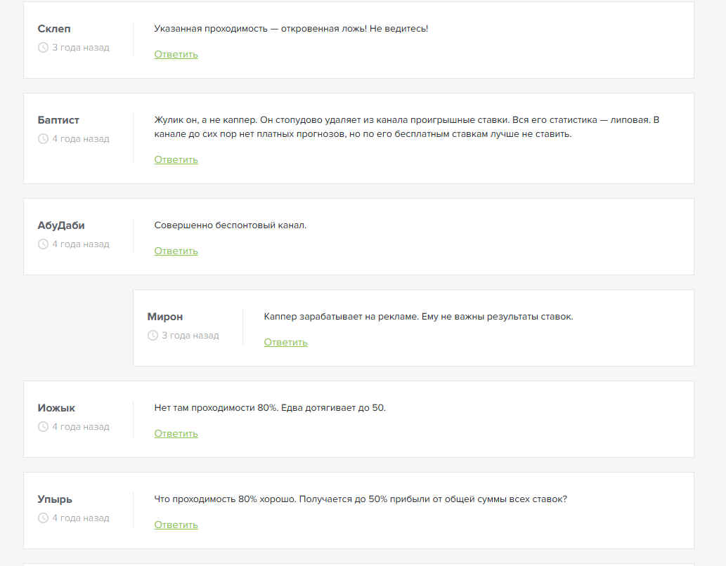 Из-за отсутствия платных услуг капер не делится отзывами от клиентов. Но в интернете мы нашли несколько негативных комментариев, которые говорят о низкой проходимости прогнозов Матвея.