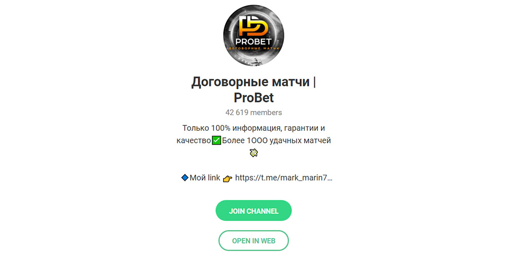 «Договорные матчи | ProBet» — телеграмм-канал, который продает прогнозы на спорт, обещая 100% проходимость. Команда проекта называет себя инсайдерами, предлагая точные счета якобы договорных матчей. Уже на этом этапе ясно – перед нами развод. Сомнительная подача контента и другие признаки мошенничества еще больше укрепляют сомнения в надежности прогнозиста.
