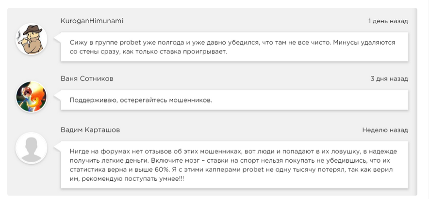 Проект в ВК Probet был создан около трех лет назад. На июнь 2025 года его страница удалена. Хотя еще несколько месяцев назад на сообщество было подписано чуть больше 17000 человек, которые почти не интересовались деятельностью прогнозиста. В среднем посты набирали 400-600 просмотров, что может говорить о применении накрутки.
