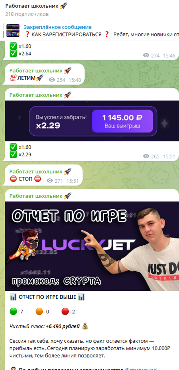 Наш сегодняшний герой предлагал азартным людям легкий заработок. Автор не скрывал свое лицо и часто публиковал короткие видео в мессенджере с призывами начать зарабатывать на Lucky Jet. Реальное имя создателя проекта неизвестно, а для связи с пользователями он использовал профиль @strategvlad.