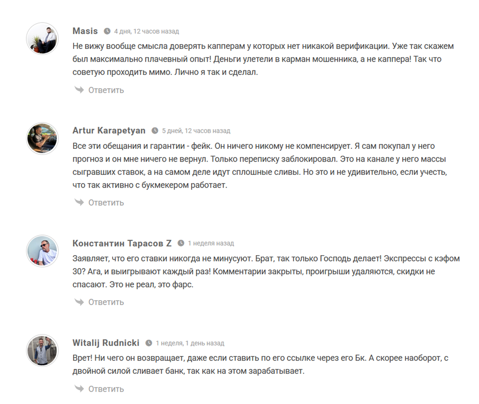 На площадках с информационными обзорами о работе с Дроздовым клиенты писали исключительно негативные отзывы. Чаще всего можно увидеть сообщения о том, что он – самый настоящий обманщик, поэтому верить ему нельзя. Капер обманом заманивает читателей в блог, утверждает, что владеет инсайдерской информацией по договорнякам, но на самом деле ничего у него нет.