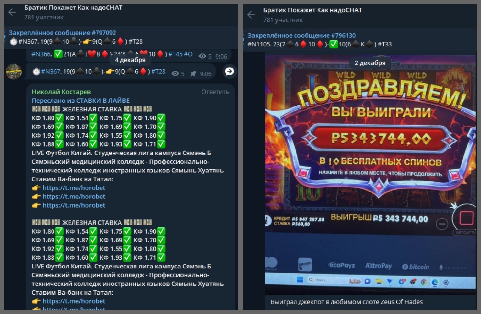 Что еще «интересного» есть в Телеграме Регуляр 21 Бот? Это периодическая реклама договорных матчей по футболу и отчеты о «победах» неустановленных лиц в слотах, где они легко «рубят» по 5 миллионов рублей аналогично Мардану Рзаеву с его «карточными играми». Рассматривать контент можно лишь как мошеннический, добавочно обогащающий @Pizdec123 и позволяющий перенаправлять случайных лиц на сторонние сомнительные ресурсы для слива банка.