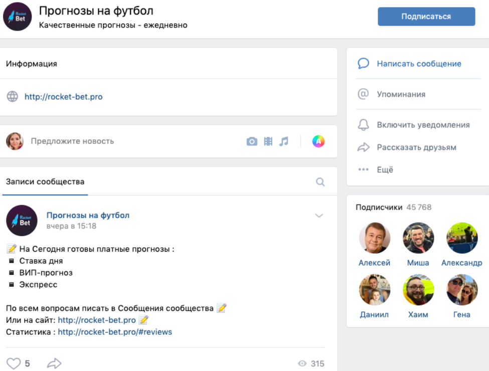 Деятельность Rocket bet pro во ВКонтакте и на сайте