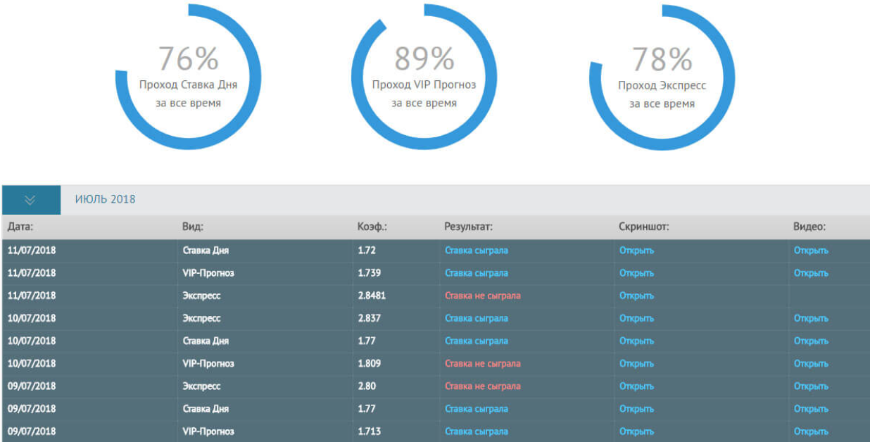 На официальном сайте расположили разделы с актуальными прогнозами, их стоимостью, статистикой проходимости, контактными данными для связи с админами.