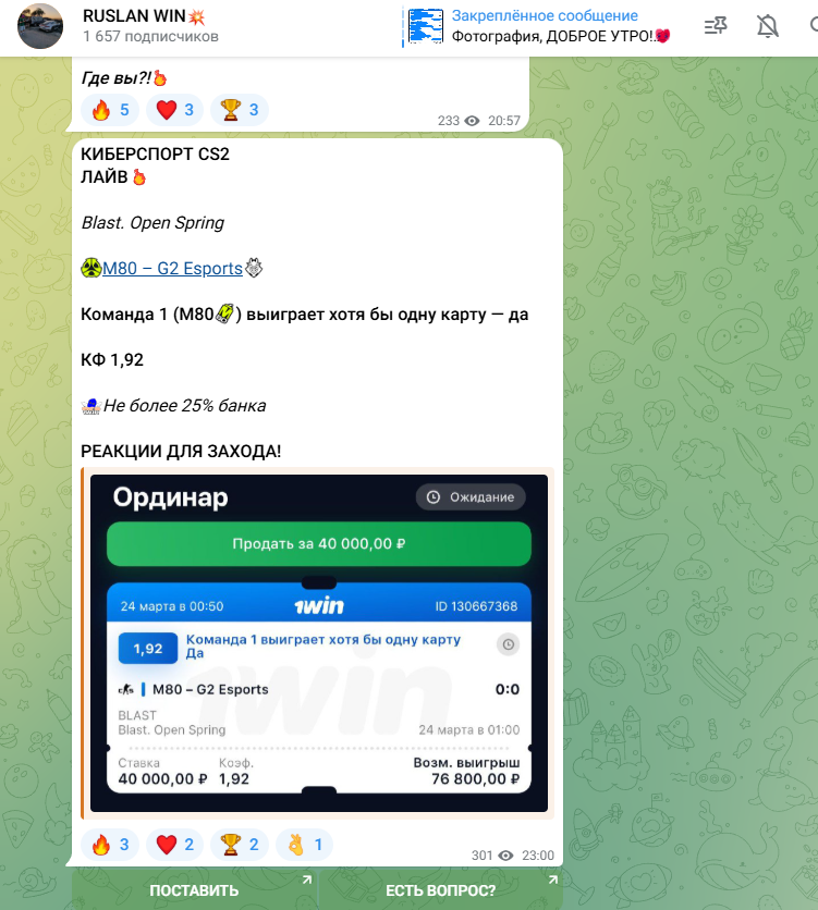 Владельцем канала является Ruslan_onewin. Почти в каждом посте он агрессивно рекламирует букмекерскую контору. Иногда он даже заявляет, что регистрация в БК по его ссылке – необходимое требование для сотрудничества. На самом деле капер просто получает деньги с каждой ставки, которую сольет его реферал. Именно поэтому ему важно заставить пройти регистрацию максимальное количество беттеров.