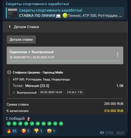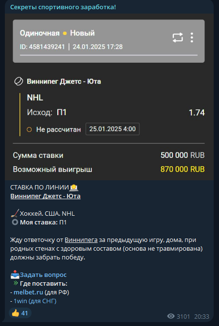 ТГ-канал Секреты спортивного заработка работает всего несколько месяцев, с декабря 2024 года, но уже сумел привлечь немалую аудиторию. На момент написания статьи, на проект подписано более 7500 пользователей. Причем активность проявляет около 50% игроков. Однако такая вовлеченность беттеров не исключает того факта, что среди подписчиков могут быть фейки – боты, привлекаемые сервисами накрутки.