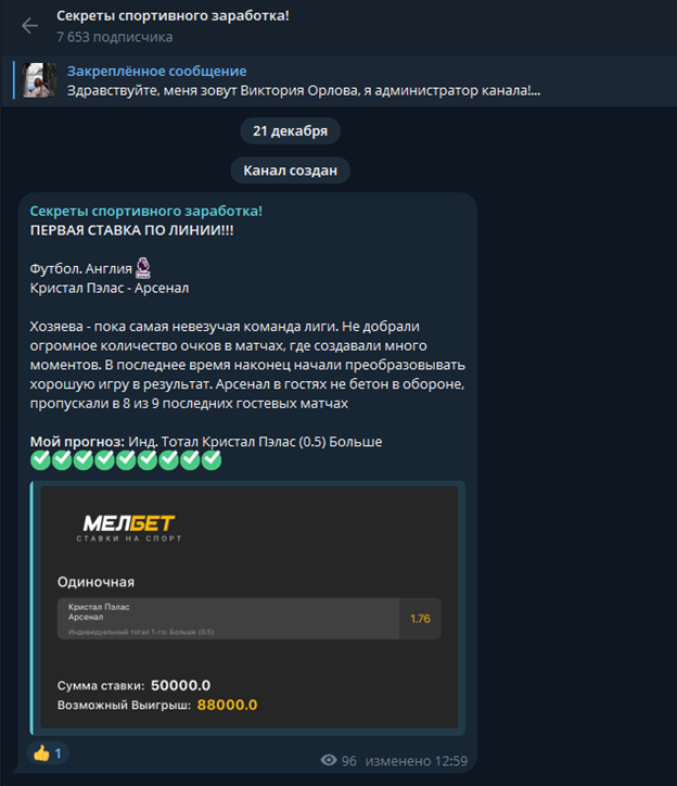 Проект Секреты спортивного заработка – Телеграмм канал, в котором подписчикам предлагают бесплатные прогнозы для ставок на несколько видов спорта. Каппер ресурса заявляет о том, что играет по собственной стратегии стабильного заработка и призывает беттеров повторять ее ставки, чтобы регулярно получать прибыль со спортивных пари. Ниже рассмотрим, насколько надежная аналитика публикуется на канале, и заслуживает ли прогнозист доверия пользователей.