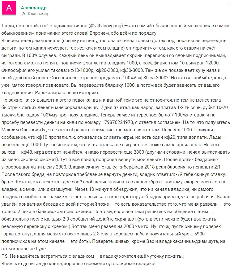 Влад Литвинов — изворотливый персонаж, вся деятельность которого без сомнений ведется с командой «помощников» и нацелена на развод. @vl_litvinov оберет вас до нитки и исчезнет, а вердикту есть объективные причины: