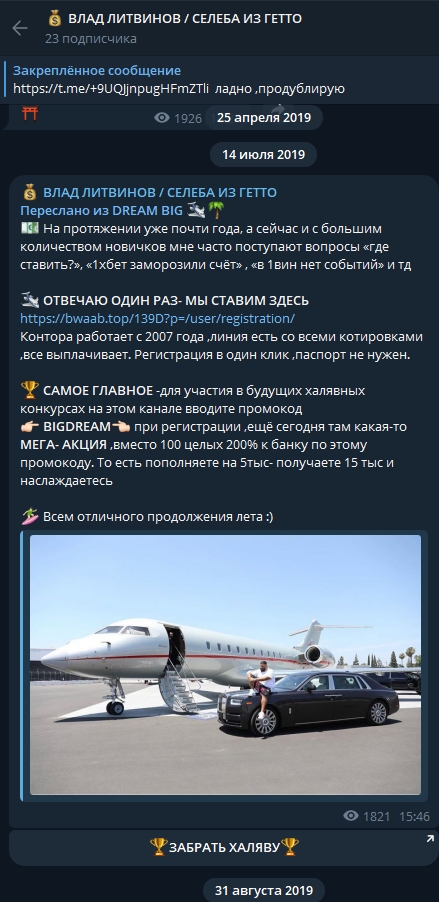 Сейчас Vlad Litvinov сидит в Телеграмм как Alva @maxdream, и теперь мечтает заработать «лям долларов» на проекте DREAM BIG, склоняя пользователей мессенджера к тому же. Среди известных адресов ресурса — @dreambigdick, @dreambigbet и применявшийся осенью 2024 @arbitrazh_trafikax, а далее разберемся — стоит ли доверять россказням Литвинова, обещающего бессрочный доступ в вип-чат неясного наполнения при наличии «золотых гор».
